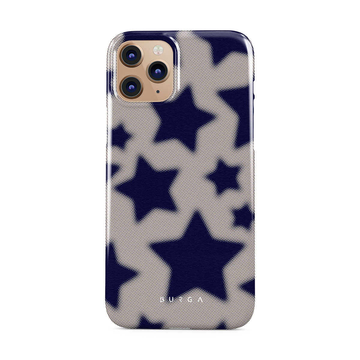 Rock a touch of '90s nostalgia with the Starstruck iPhone 11 Pro phone case design. Its nude background is scattered with bold blue stars; each star hints at stories of hope and youthful dreams, blending simplicity with depth.