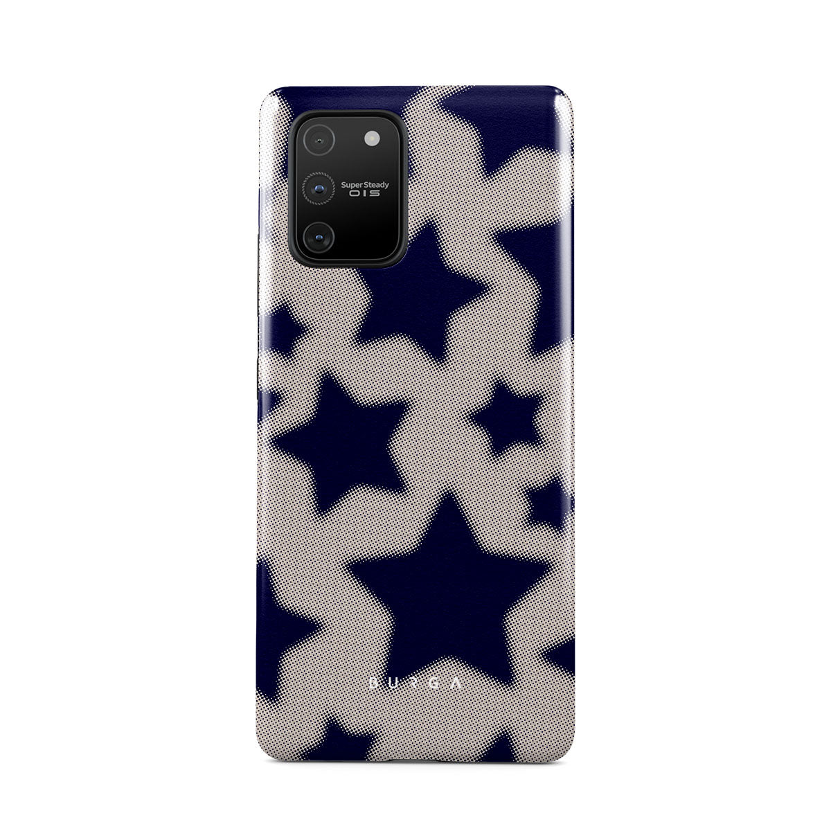 Rock a touch of '90s nostalgia with the Starstruck Samsung Galaxy S10 Lite phone case design. Its nude background is scattered with bold blue stars; each star hints at stories of hope and youthful dreams, blending simplicity with depth.