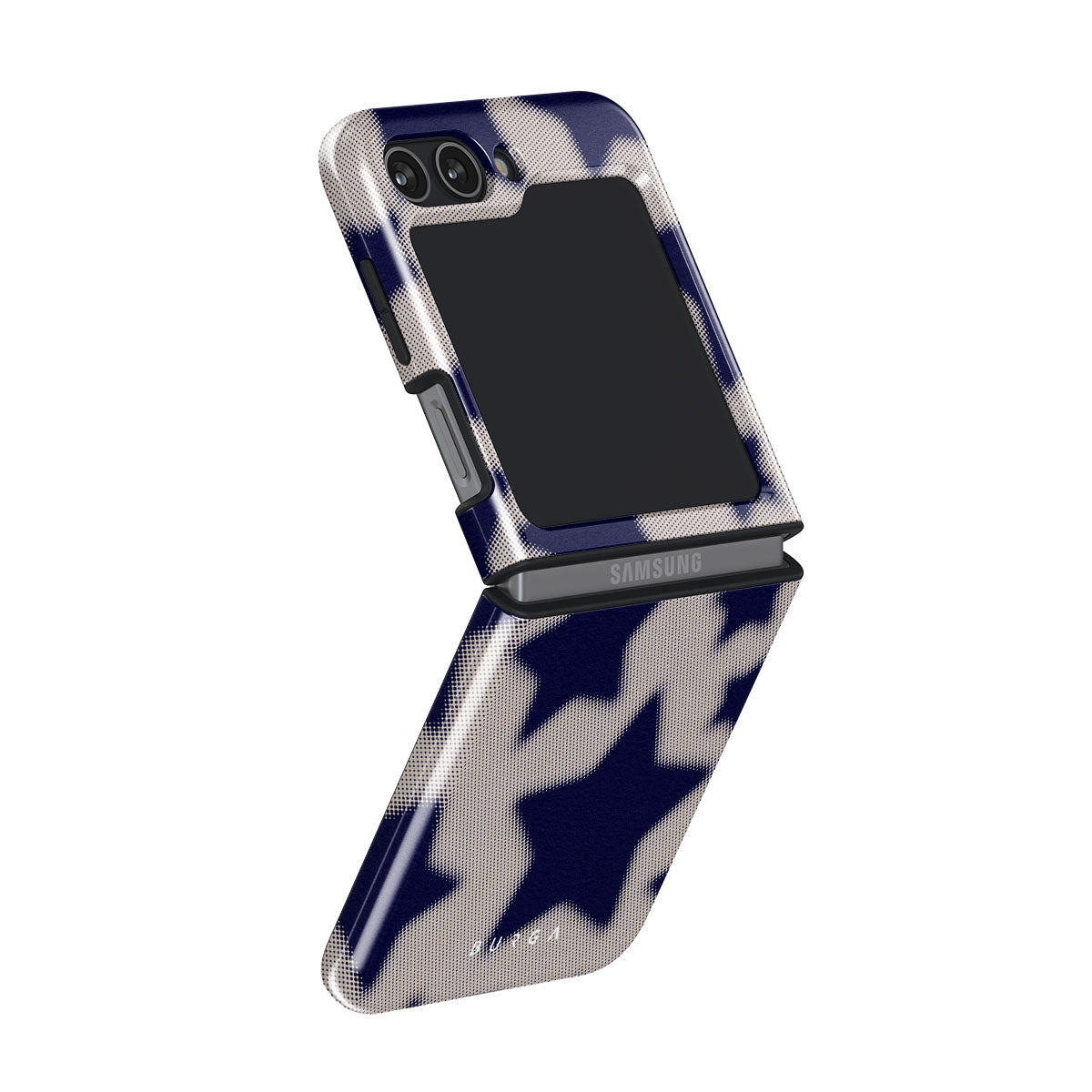 Rock a touch of '90s nostalgia with the Starstruck Samsung Galaxy Z Flip 5 phone case design. Its nude background is scattered with bold blue stars; each star hints at stories of hope and youthful dreams, blending simplicity with depth.