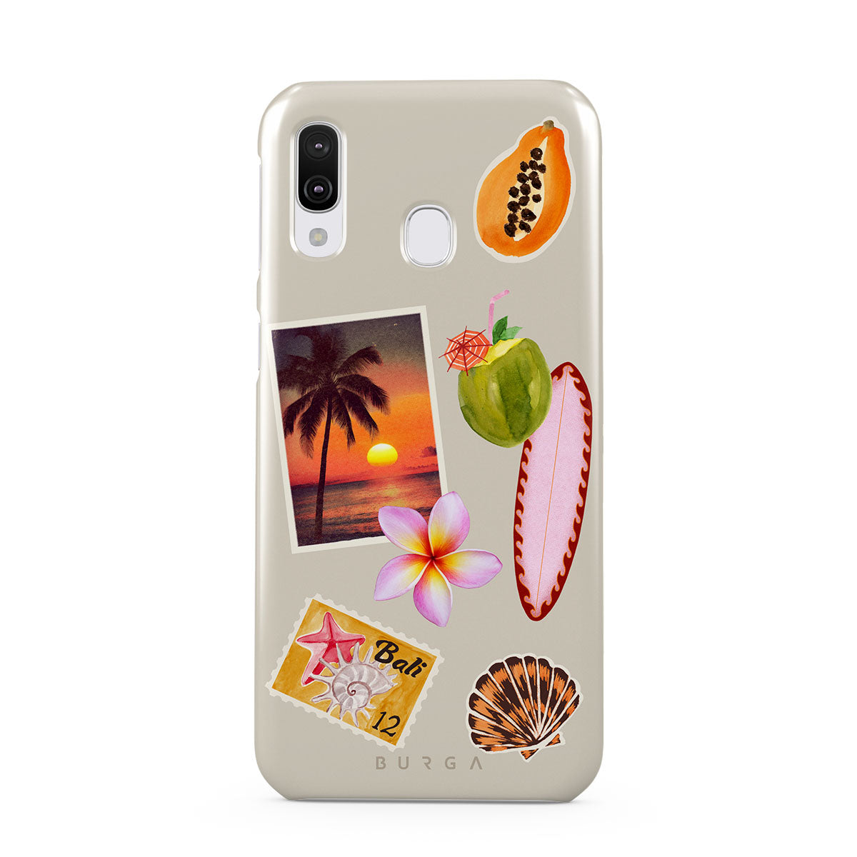 This design features: tropical sunset photo, papaya, green coconut, pink surfboard, pink plumeria flower, orange shell, Bali postcard
