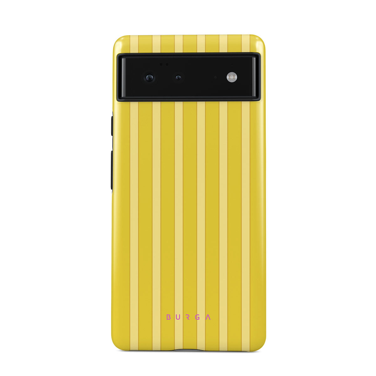 Bask in the glow of Sunbreak. This Google Pixel 6a phone case design features bold yellow stripes, reminiscent of beachside cabanas and sunny summer days. It’s a chic celebration of joy and simplicity.