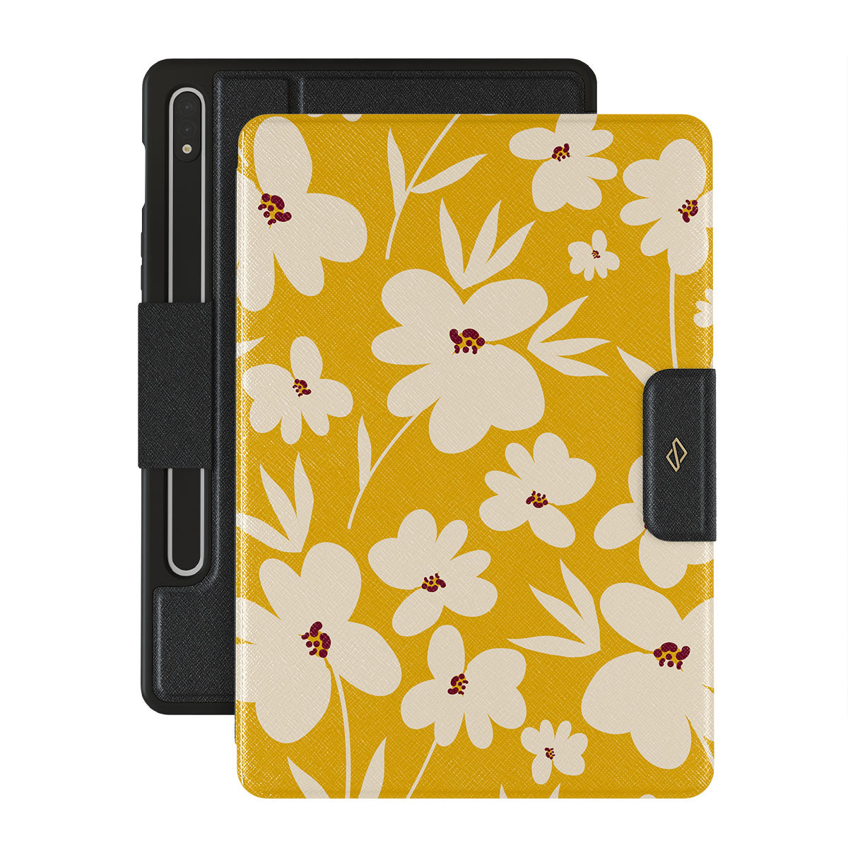 Full of fresh produce, warm rays of sunshine, and relaxing moments, our Sunday Market {Galaxy Tab Model} Samsung Galaxy Tab S10+ folio case encase all of this! The vintage mustard-yellow background with beautiful creme flowers will add that soft floral touch to your wardrobe while protecting your device from unexpected falls!