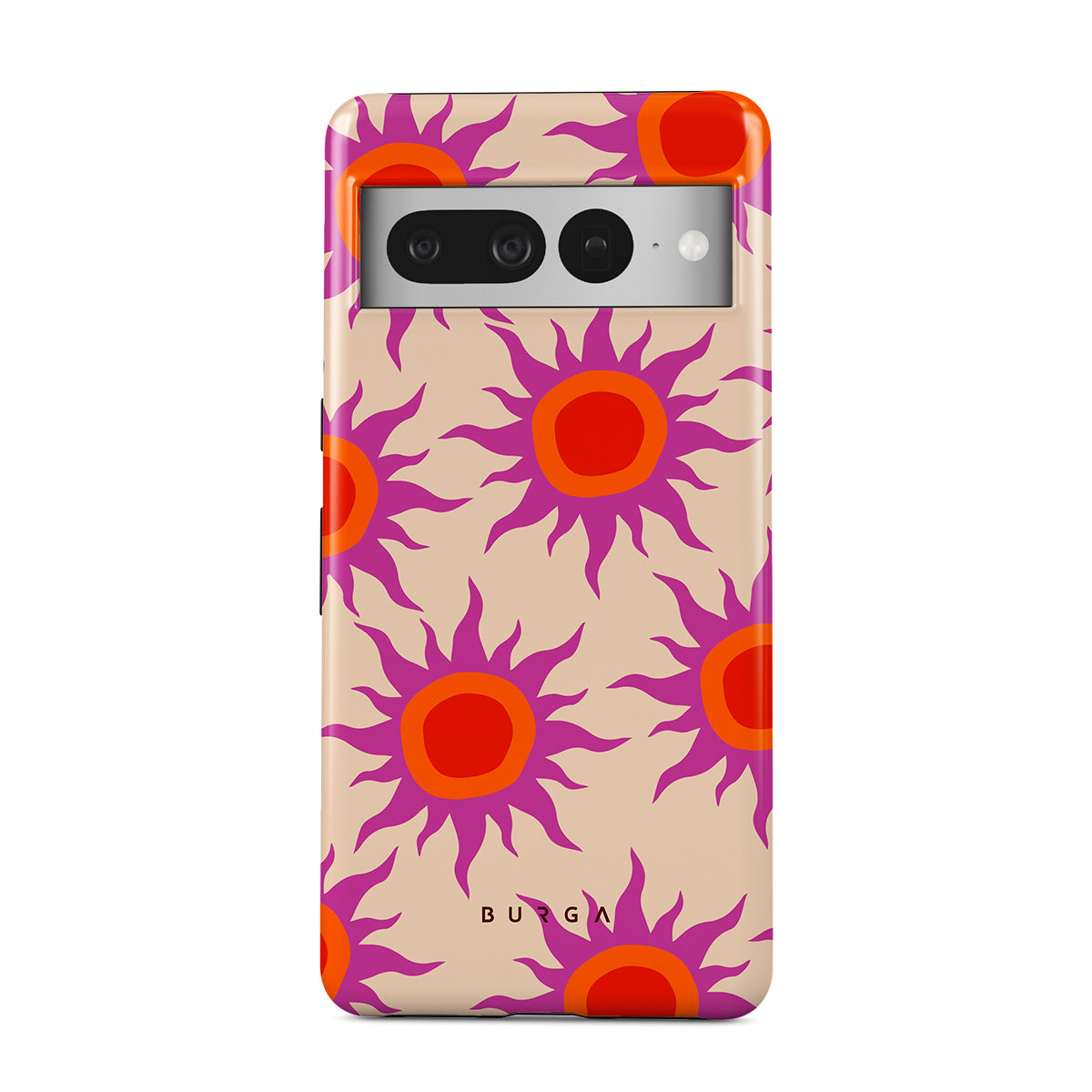Discover the radiant serenity of the Sunset Glow design, a harmonious blend of soothing pastels and fiery suns. Vivacious viva magenta rays add a playful touch, perfectly balancing tranquility and dynamism. More than just a fashion accessory, this striking Google Pixel 7 Pro phone case mirrors your unique personality and zest for life.