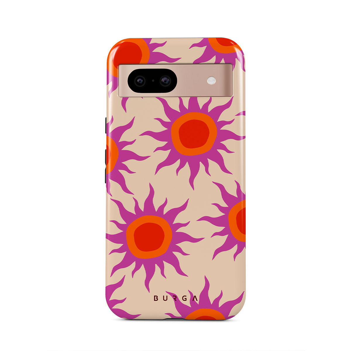 Discover the radiant serenity of the Sunset Glow design, a harmonious blend of soothing pastels and fiery suns. Vivacious viva magenta rays add a playful touch, perfectly balancing tranquility and dynamism. More than just a fashion accessory, this striking Google Pixel 8a phone case mirrors your unique personality and zest for life.