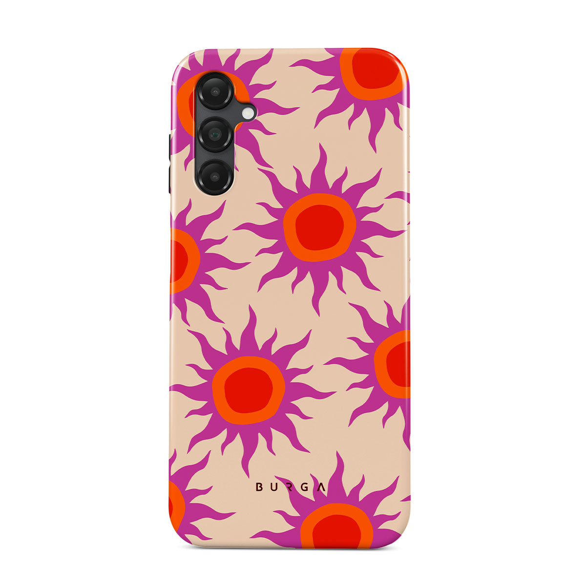 Discover the radiant serenity of the Sunset Glow design, a harmonious blend of soothing pastels and fiery suns. Vivacious viva magenta rays add a playful touch, perfectly balancing tranquility and dynamism. More than just a fashion accessory, this striking Samsung Galaxy A14 5G phone case mirrors your unique personality and zest for life.