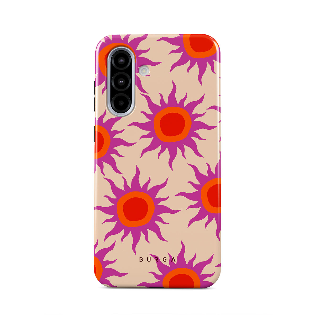 Discover the radiant serenity of the Sunset Glow design, a harmonious blend of soothing pastels and fiery suns. Vivacious viva magenta rays add a playful touch, perfectly balancing tranquility and dynamism. More than just a fashion accessory, this striking Samsung Galaxy A56 5G phone case mirrors your unique personality and zest for life.