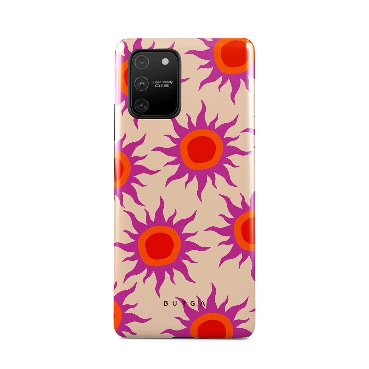 Discover the radiant serenity of the Sunset Glow design, a harmonious blend of soothing pastels and fiery suns. Vivacious viva magenta rays add a playful touch, perfectly balancing tranquility and dynamism. More than just a fashion accessory, this striking Samsung Galaxy S10 Lite phone case mirrors your unique personality and zest for life.