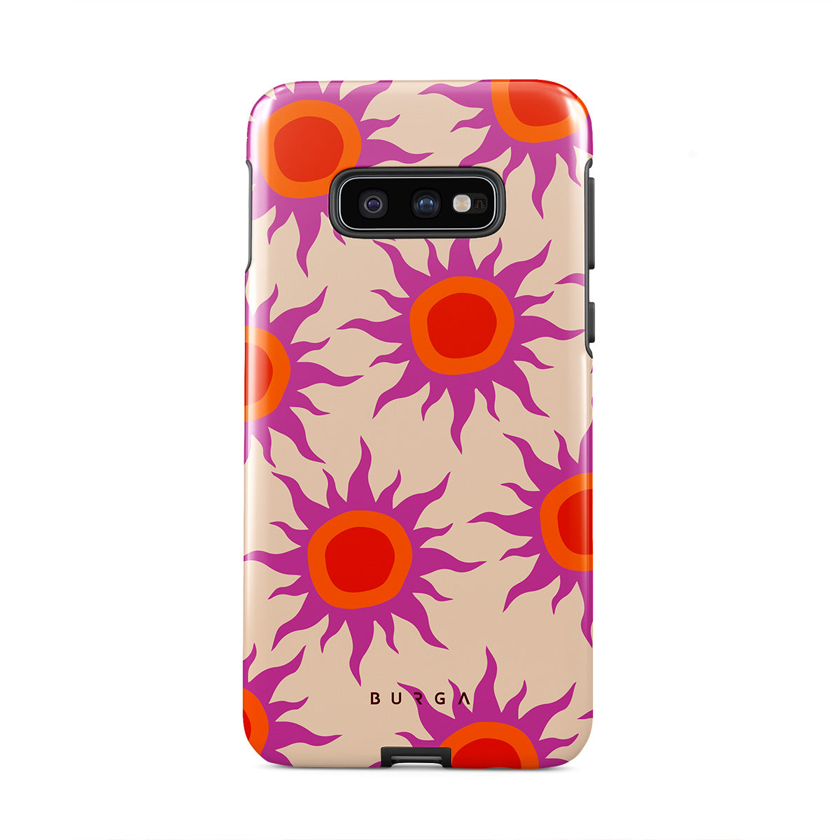 Discover the radiant serenity of the Sunset Glow design, a harmonious blend of soothing pastels and fiery suns. Vivacious viva magenta rays add a playful touch, perfectly balancing tranquility and dynamism. More than just a fashion accessory, this striking Samsung Galaxy S10E phone case mirrors your unique personality and zest for life.