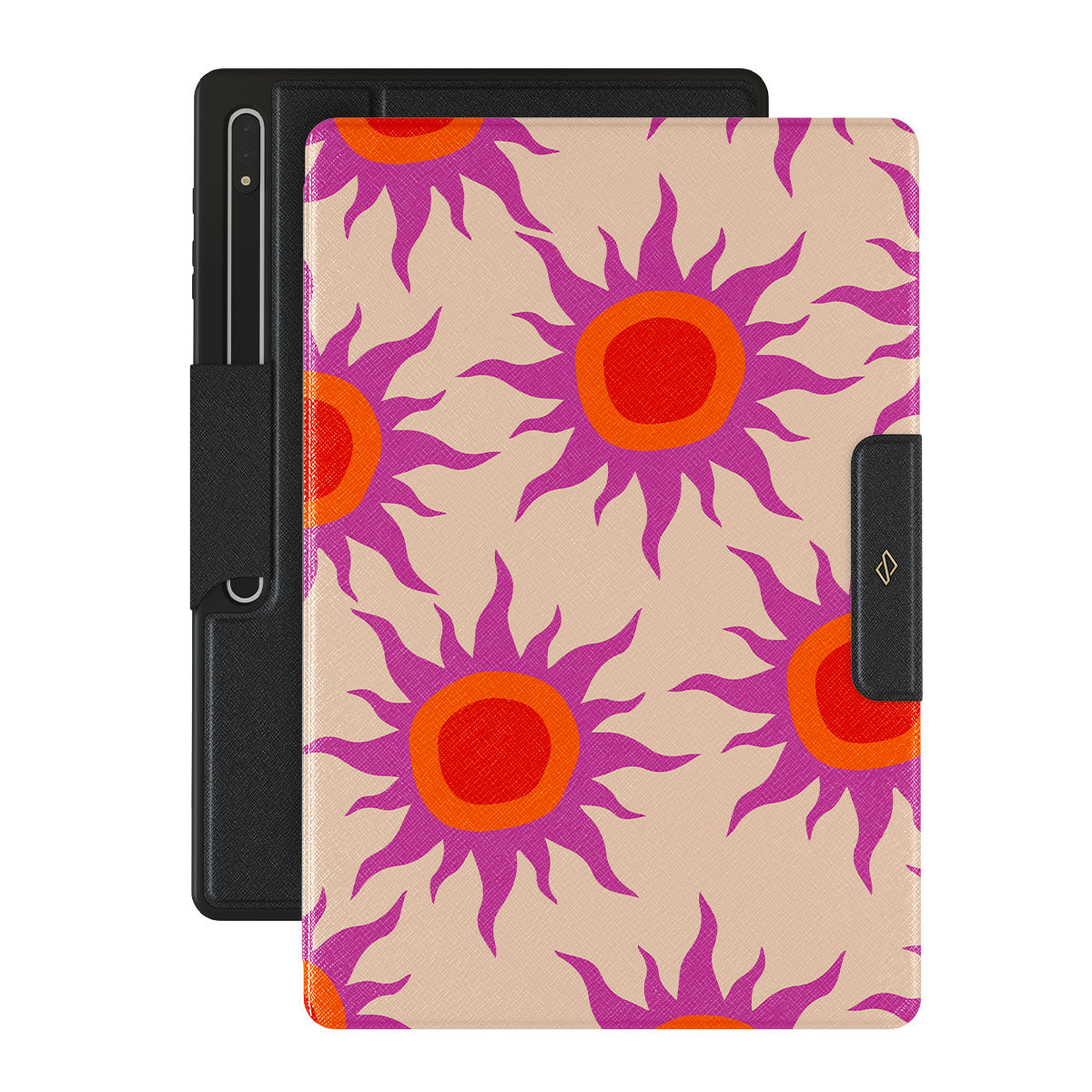 Discover the radiant serenity of the Sunset Glow design, a harmonious blend of soothing pastels and fiery suns. Vivacious viva magenta rays add a playful touch, perfectly balancing tranquility and dynamism. More than just a fashion accessory, this striking Samsung Galaxy Tab S8 Ultra folio case mirrors your unique personality and zest for life.