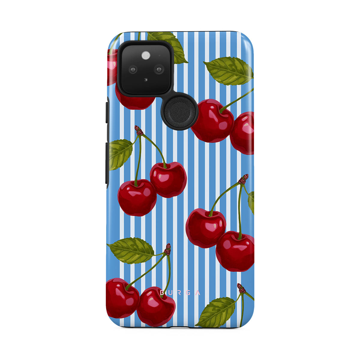 Cherries dangle like earrings from blue skies, a fun reminder of that first bite of summer, juicy and bursting with laughter. Meet our Sweet Moment Google Pixel 5 phone case design.
