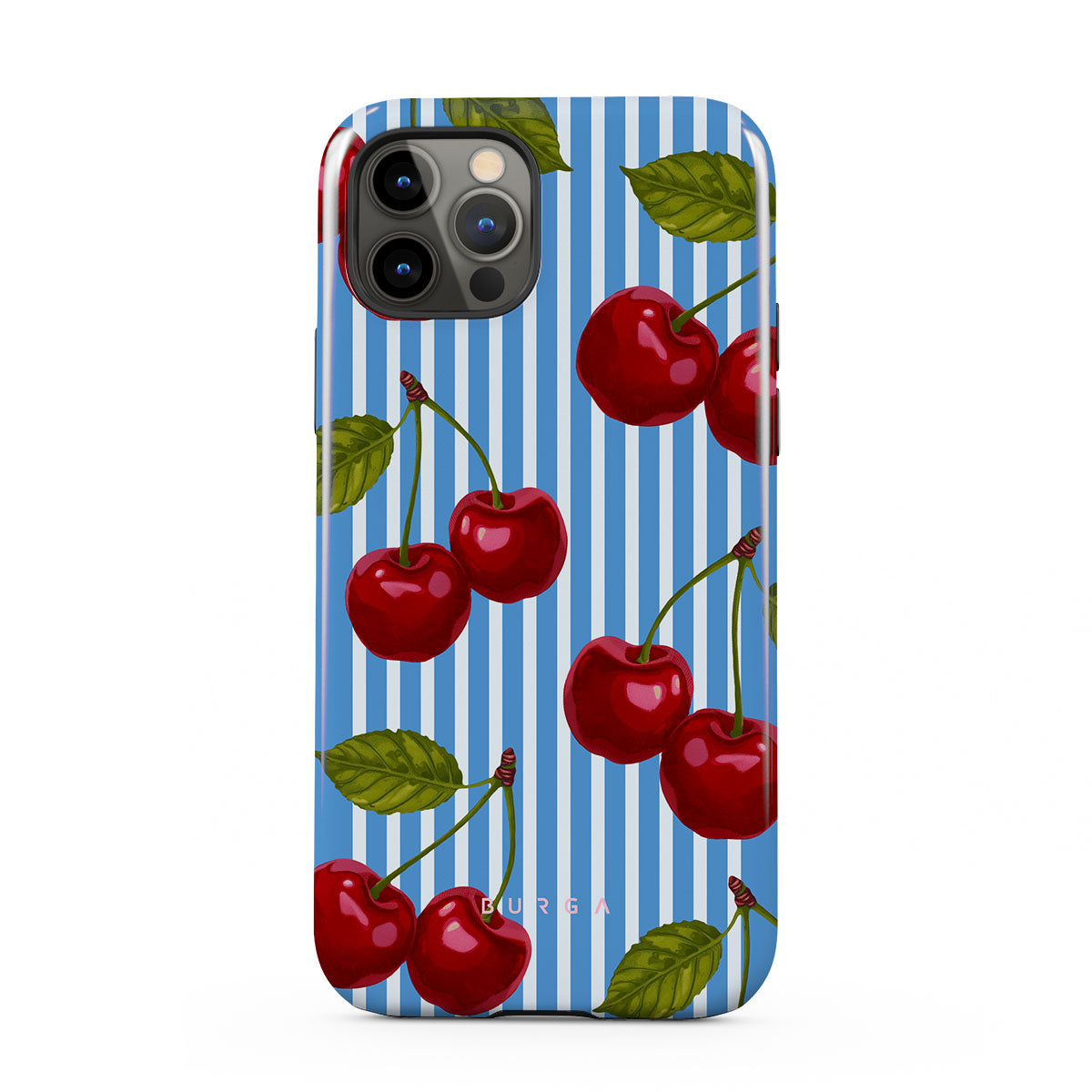 Cherries dangle like earrings from blue skies, a fun reminder of that first bite of summer, juicy and bursting with laughter. Meet our Sweet Moment iPhone 12 Pro phone case design.