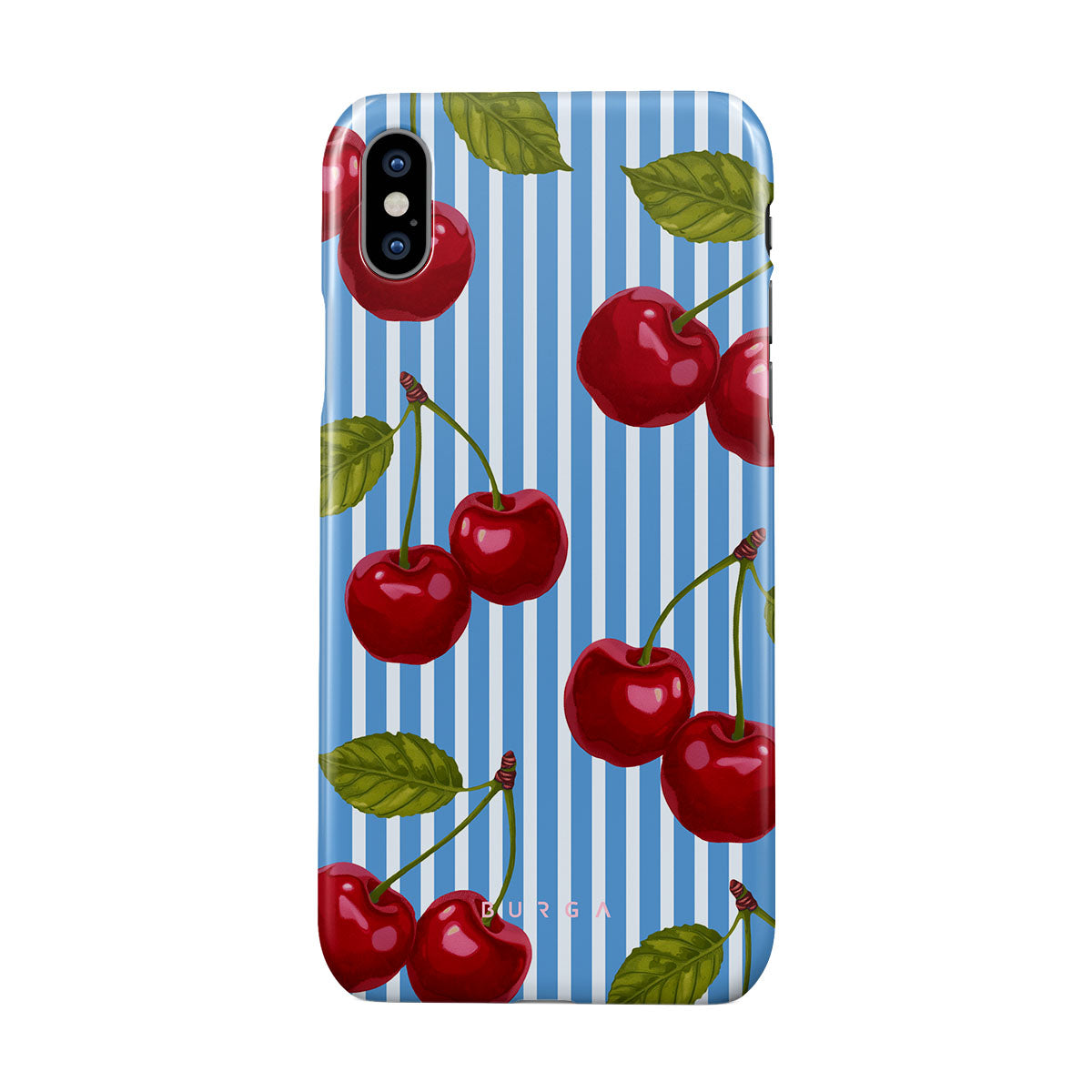 Cherries dangle like earrings from blue skies, a fun reminder of that first bite of summer, juicy and bursting with laughter. Meet our Sweet Moment iPhone XS Max phone case design.