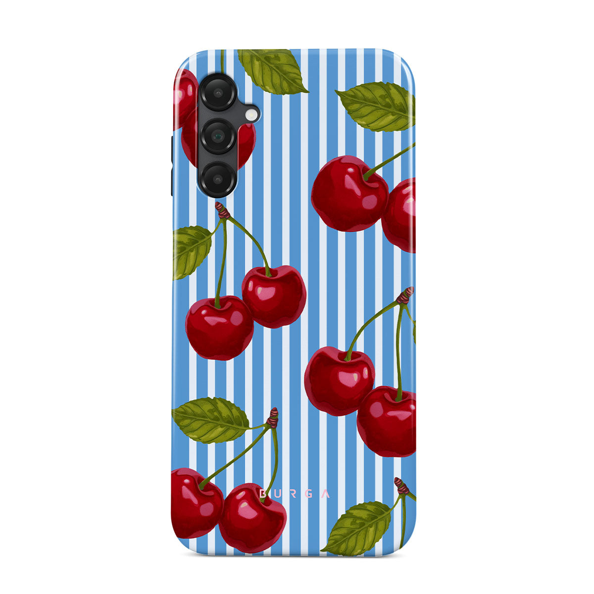 Cherries dangle like earrings from blue skies, a fun reminder of that first bite of summer, juicy and bursting with laughter. Meet our Sweet Moment Samsung Galaxy A14 5G phone case design.