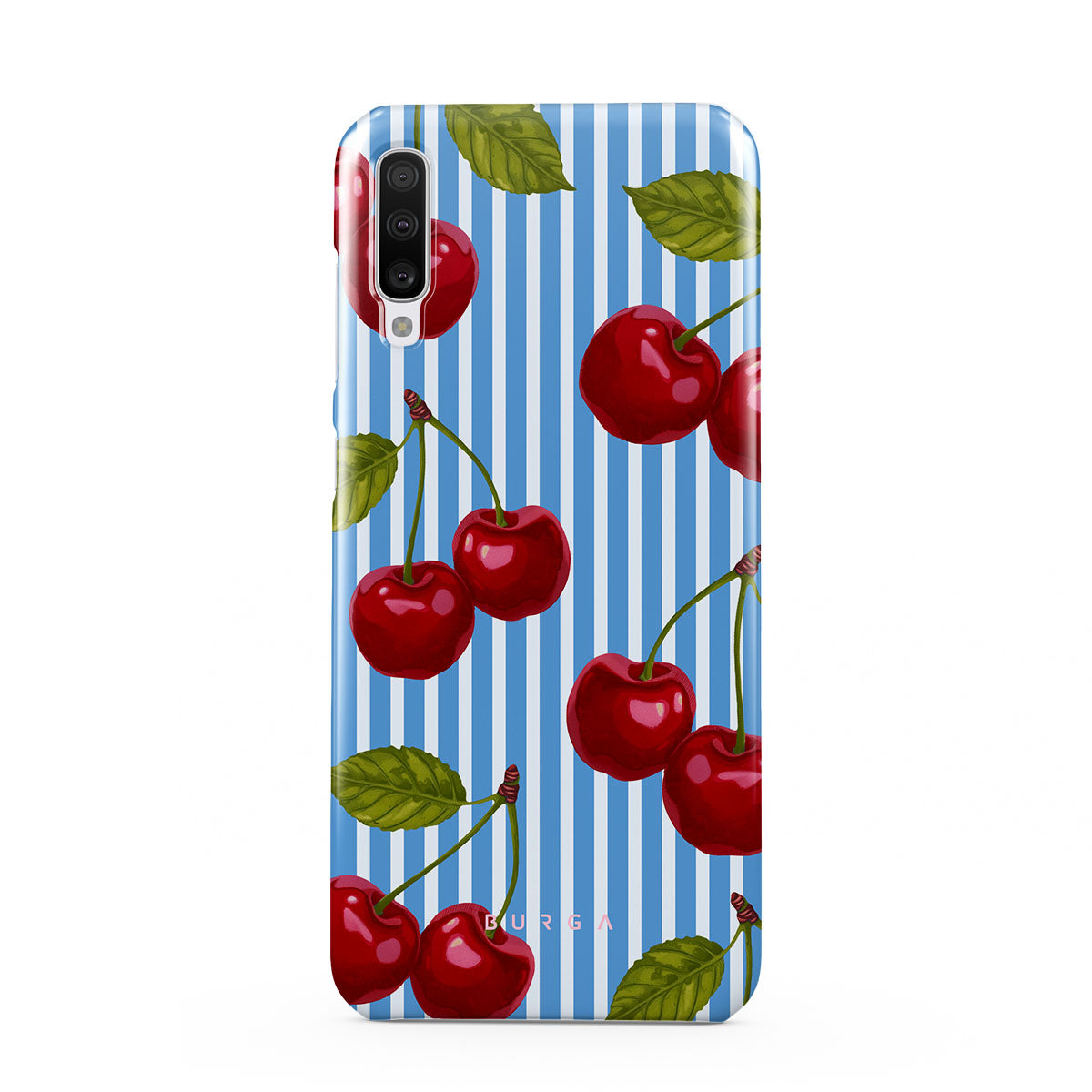 Cherries dangle like earrings from blue skies, a fun reminder of that first bite of summer, juicy and bursting with laughter. Meet our Sweet Moment Samsung Galaxy A70 phone case design.