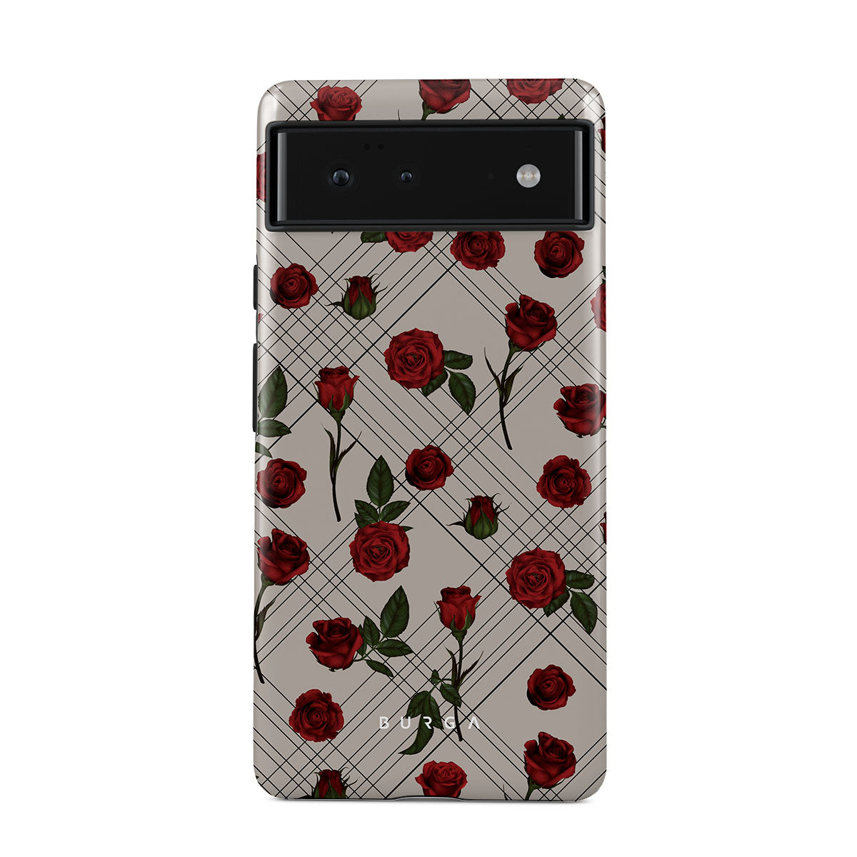 Embrace the subtle rebellion of our Sweet Sin Google Pixel 6a phone case design. On a muted nude-gray canvas, scattered small red roses hint at passions hidden beneath the surface. A design that balances the delicate with the daring. Crafted for those who find beauty in the unexpected and wear their edge with elegance.