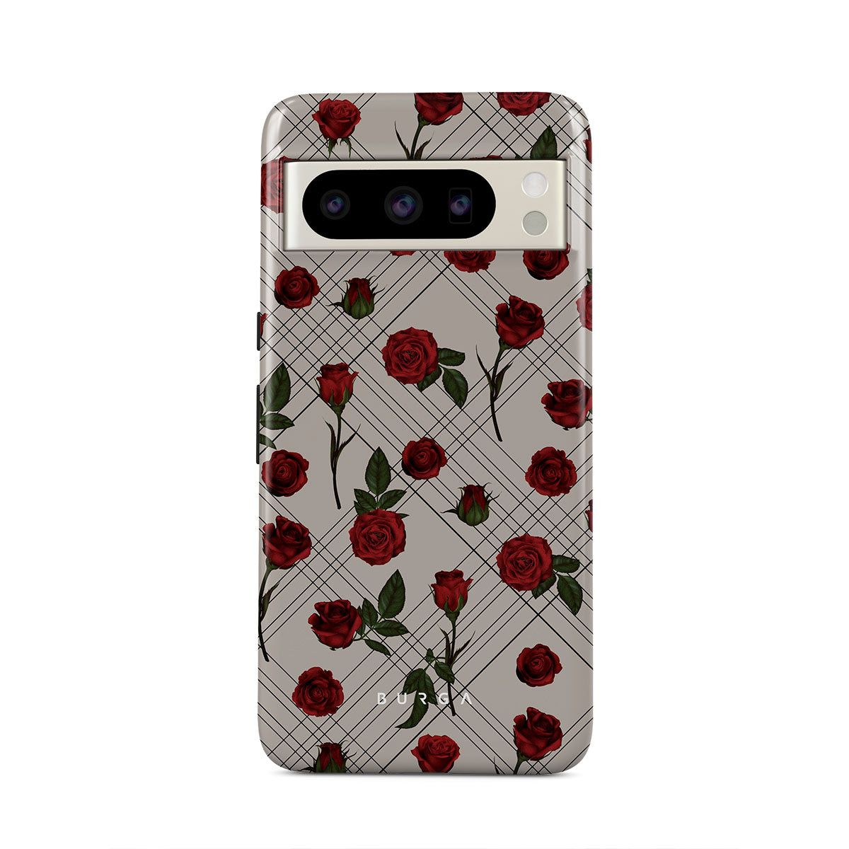 Embrace the subtle rebellion of our Sweet Sin Google Pixel 8 Pro phone case design. On a muted nude-gray canvas, scattered small red roses hint at passions hidden beneath the surface. A design that balances the delicate with the daring. Crafted for those who find beauty in the unexpected and wear their edge with elegance.