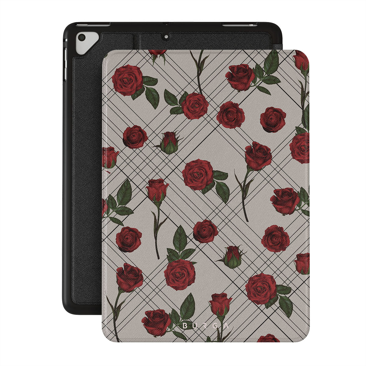 Embrace the subtle rebellion of our Sweet Sin iPad 9.7 (6th/5th Gen) folio case design. On a muted nude-gray canvas, scattered small red roses hint at passions hidden beneath the surface. A design that balances the delicate with the daring. Crafted for those who find beauty in the unexpected and wear their edge with elegance.