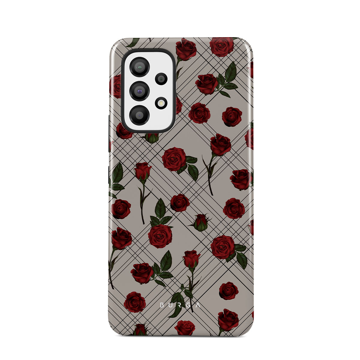 Embrace the subtle rebellion of our Sweet Sin Samsung Galaxy A53 phone case design. On a muted nude-gray canvas, scattered small red roses hint at passions hidden beneath the surface. A design that balances the delicate with the daring. Crafted for those who find beauty in the unexpected and wear their edge with elegance.