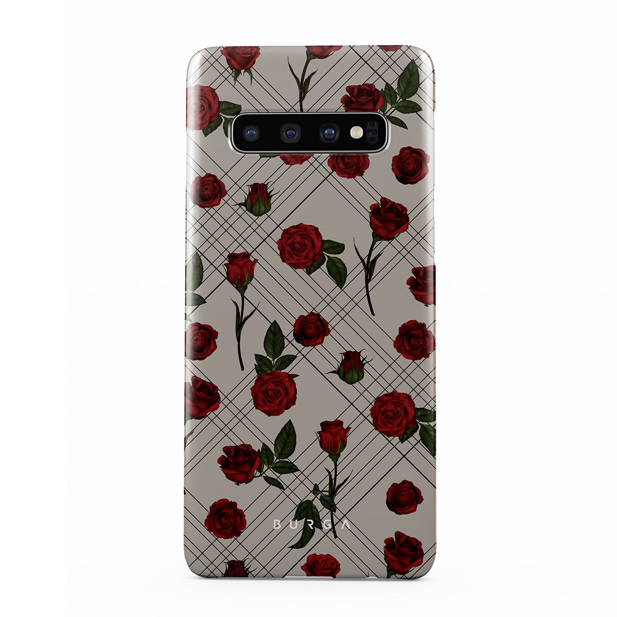 Embrace the subtle rebellion of our Sweet Sin Samsung Galaxy S10 Plus phone case design. On a muted nude-gray canvas, scattered small red roses hint at passions hidden beneath the surface. A design that balances the delicate with the daring. Crafted for those who find beauty in the unexpected and wear their edge with elegance.