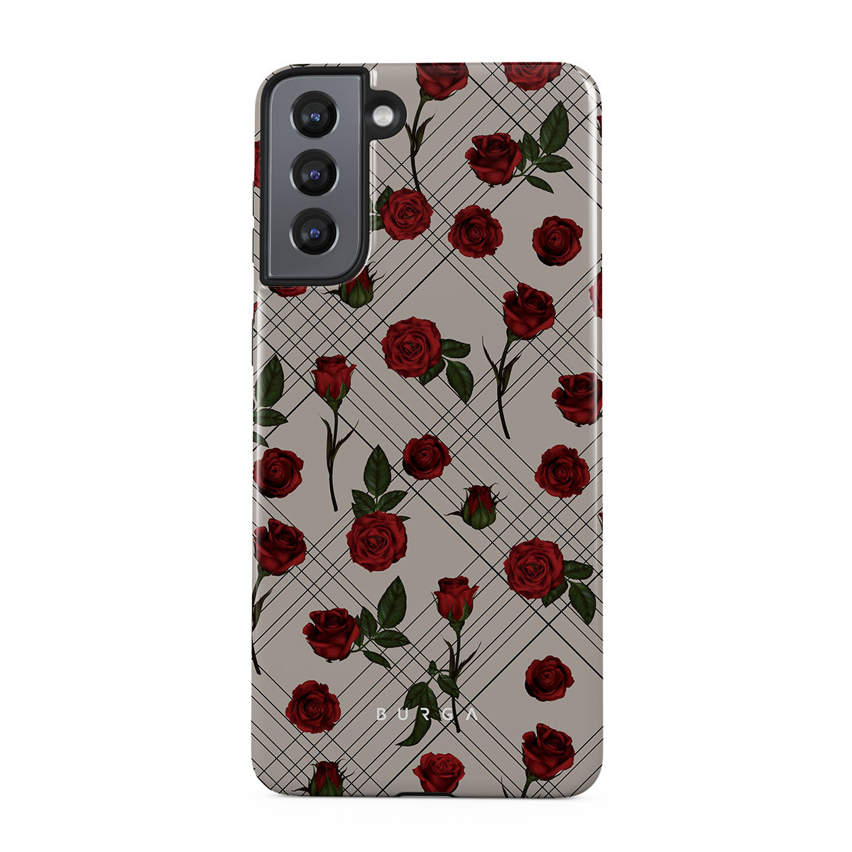 Embrace the subtle rebellion of our Sweet Sin Samsung Galaxy S21 phone case design. On a muted nude-gray canvas, scattered small red roses hint at passions hidden beneath the surface. A design that balances the delicate with the daring. Crafted for those who find beauty in the unexpected and wear their edge with elegance.