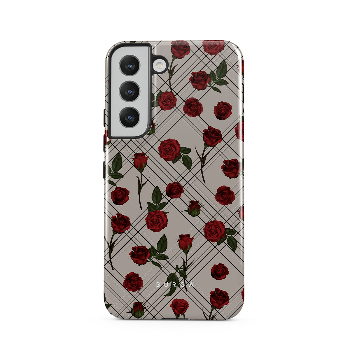 Embrace the subtle rebellion of our Sweet Sin Samsung Galaxy S22 phone case design. On a muted nude-gray canvas, scattered small red roses hint at passions hidden beneath the surface. A design that balances the delicate with the daring. Crafted for those who find beauty in the unexpected and wear their edge with elegance.