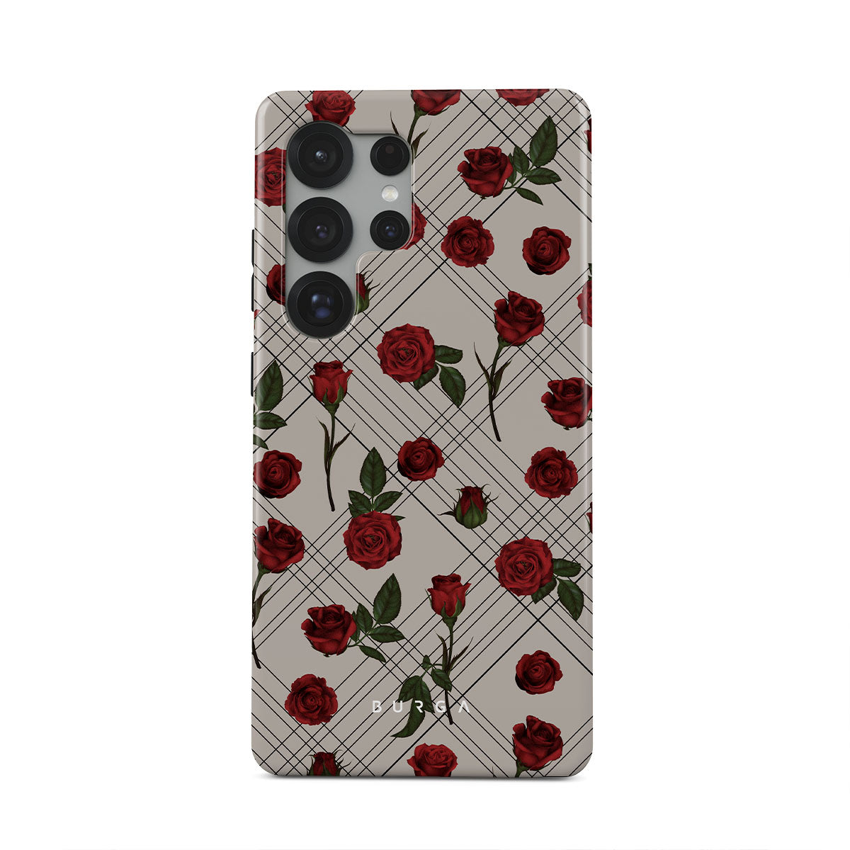 Embrace the subtle rebellion of our Sweet Sin Samsung Galaxy S25 Ultra phone case design. On a muted nude-gray canvas, scattered small red roses hint at passions hidden beneath the surface. A design that balances the delicate with the daring. Crafted for those who find beauty in the unexpected and wear their edge with elegance.