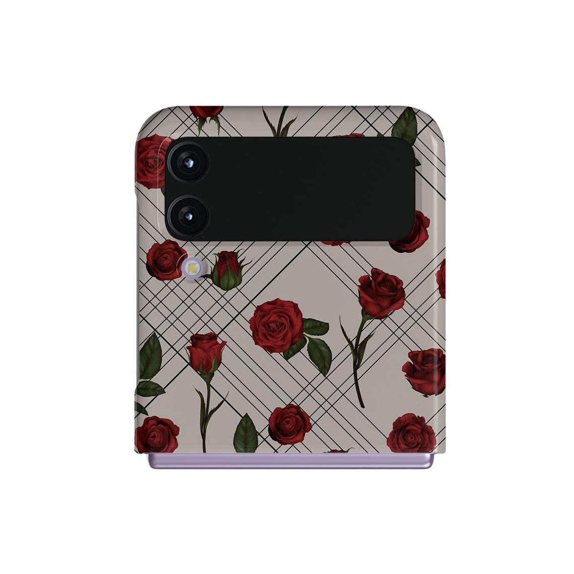 Embrace the subtle rebellion of our Sweet Sin Samsung Galaxy Z Flip 4 phone case design. On a muted nude-gray canvas, scattered small red roses hint at passions hidden beneath the surface. A design that balances the delicate with the daring. Crafted for those who find beauty in the unexpected and wear their edge with elegance.