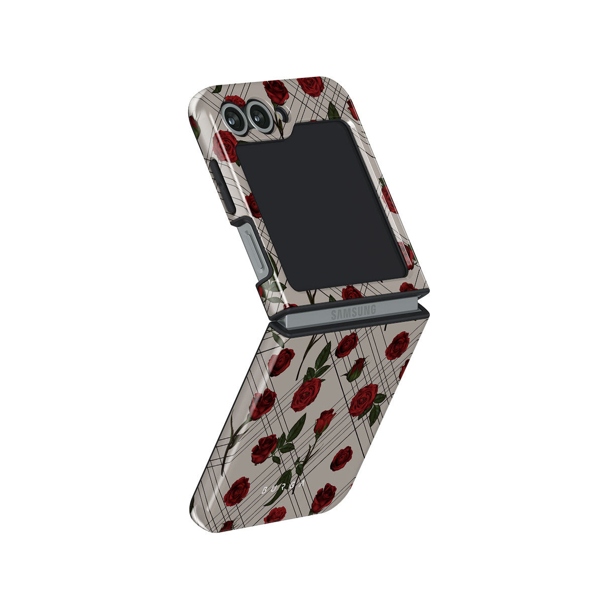 Embrace the subtle rebellion of our Sweet Sin Samsung Galaxy Z Flip 6 phone case design. On a muted nude-gray canvas, scattered small red roses hint at passions hidden beneath the surface. A design that balances the delicate with the daring. Crafted for those who find beauty in the unexpected and wear their edge with elegance.