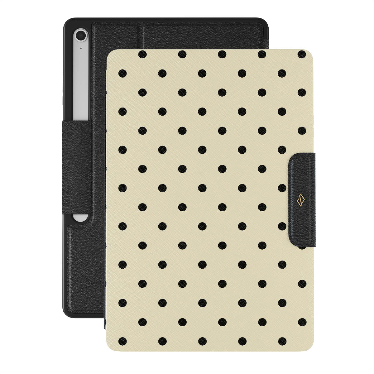 This design features: beige background with small black polka dots.
