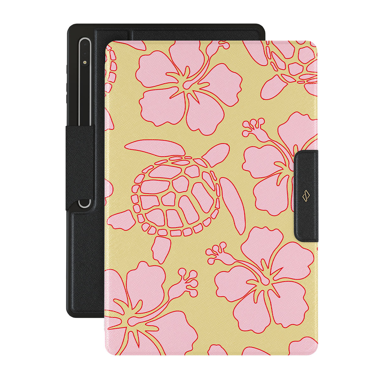 The Tan Break Samsung Galaxy Tab S8 Ultra folio case features a vibrant design with pink flowers and sea turtles on a sunny yellow background. This tropical-inspired pattern exudes a laid-back, beachy vibe, perfect for those who love vibrant and nature-themed aesthetics.