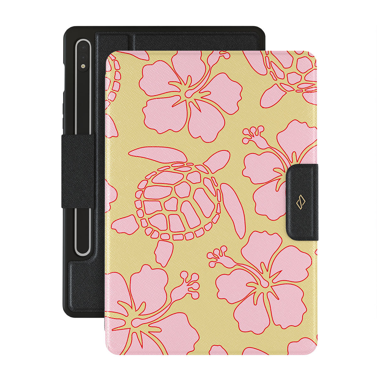 The Tan Break Samsung Galaxy Tab S9 FE folio case features a vibrant design with pink flowers and sea turtles on a sunny yellow background. This tropical-inspired pattern exudes a laid-back, beachy vibe, perfect for those who love vibrant and nature-themed aesthetics.