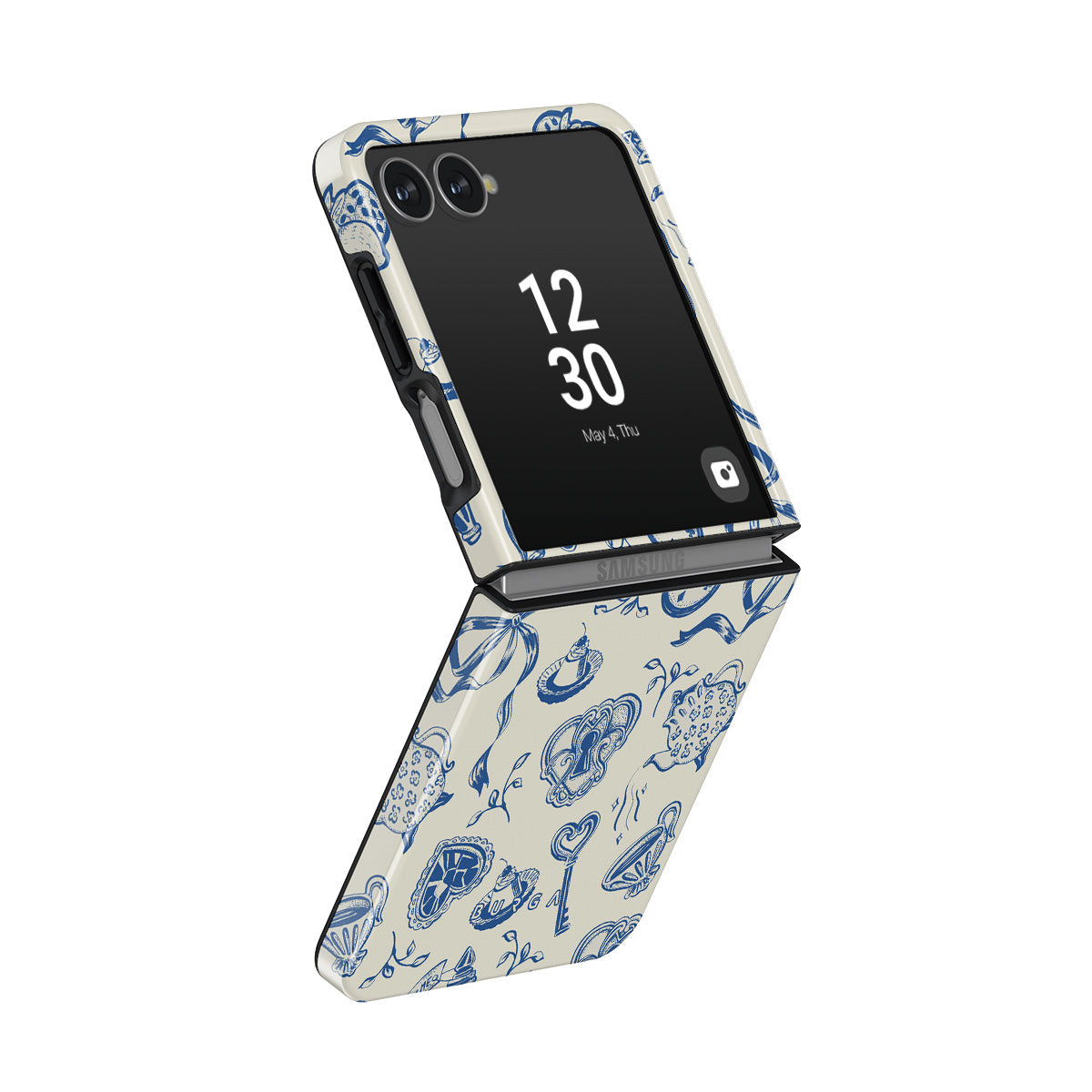 The Tea Party Samsung Galaxy Z Flip 7 phone case design is a porcelain puzzle—ribbons tangled, time warped, rules rewritten. Sit down, pour a cup, but don’t expect things to make sense. They never do.