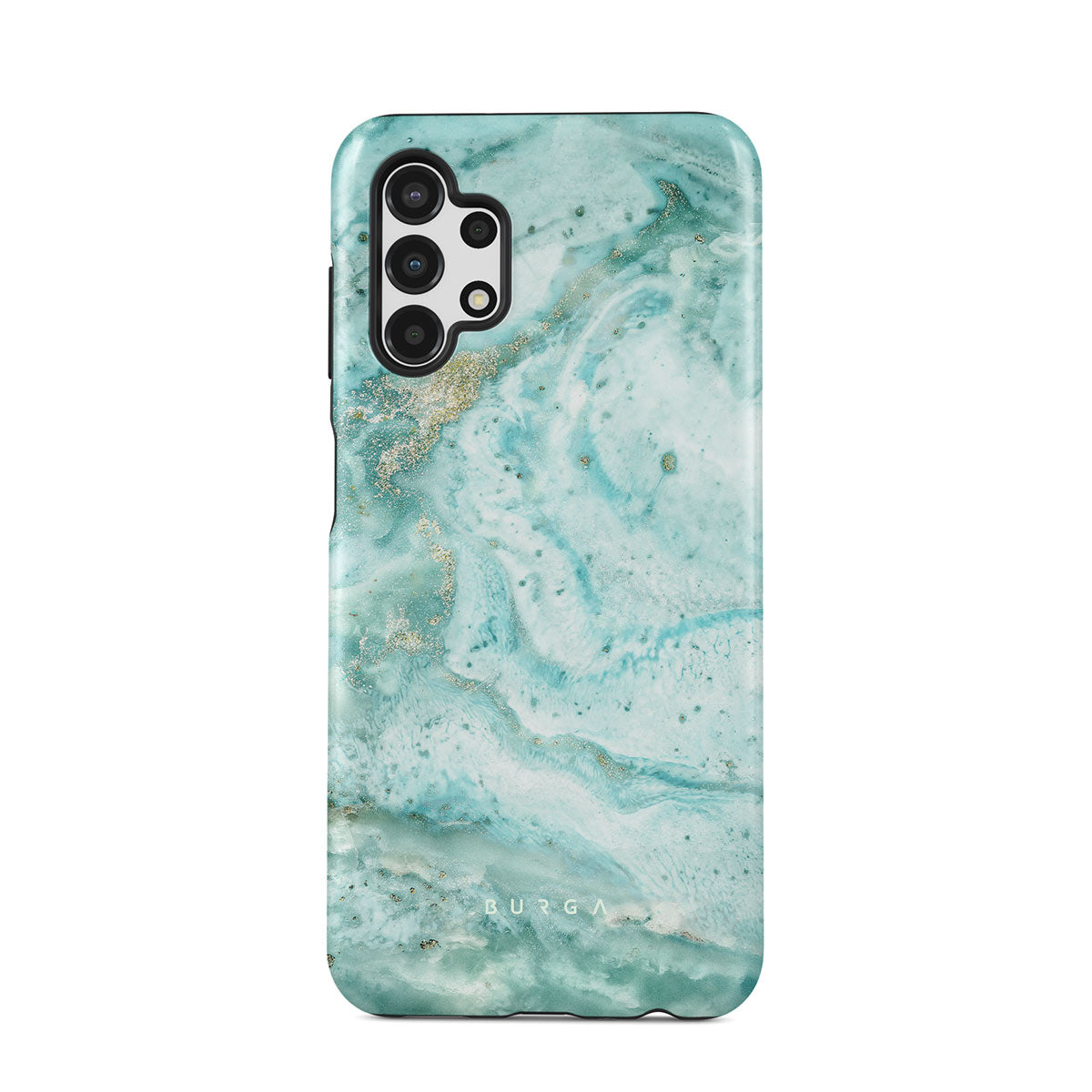 Our Uluwatu Waves Samsung Galaxy A13 4G phone case is an absolute teal dream. This phone cover features timeless and soft blue marble pattern enriched with golden color specks will surely remind you of a tropical beach teal waters while becoming a protective best friend for your cell phone.