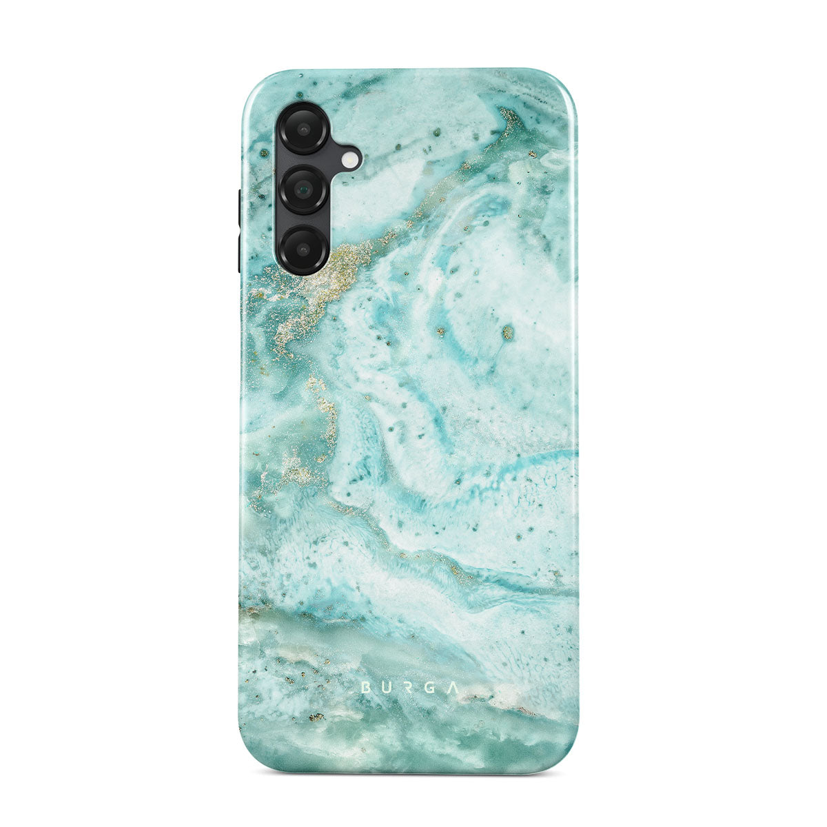 Our Uluwatu Waves Samsung Galaxy A14 5G phone case is an absolute teal dream. This phone cover features timeless and soft blue marble pattern enriched with golden color specks will surely remind you of a tropical beach teal waters while becoming a protective best friend for your cell phone.