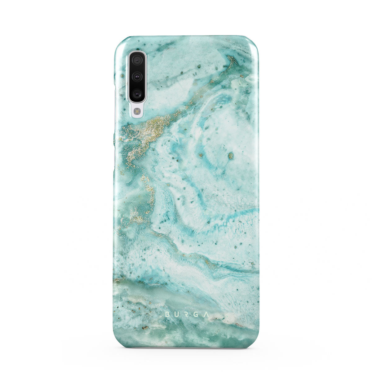 Our Uluwatu Waves Samsung Galaxy A70 phone case is an absolute teal dream. This phone cover features timeless and soft blue marble pattern enriched with golden color specks will surely remind you of a tropical beach teal waters while becoming a protective best friend for your cell phone.