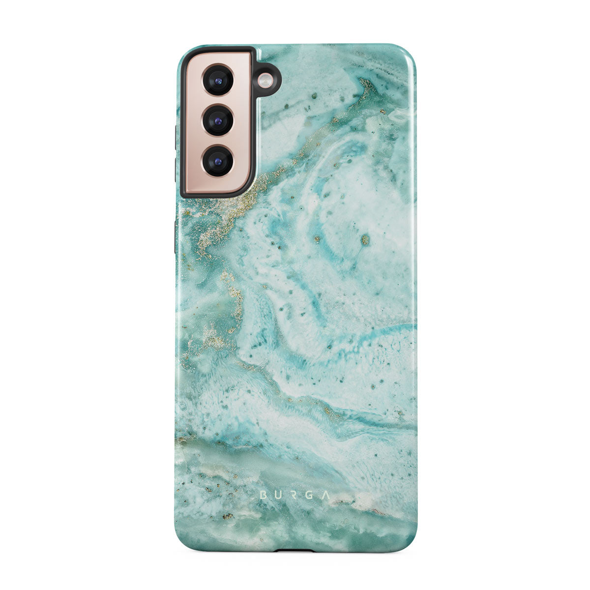 Our Uluwatu Waves Samsung Galaxy S21 Plus phone case is an absolute teal dream. This phone cover features timeless and soft blue marble pattern enriched with golden color specks will surely remind you of a tropical beach teal waters while becoming a protective best friend for your cell phone.