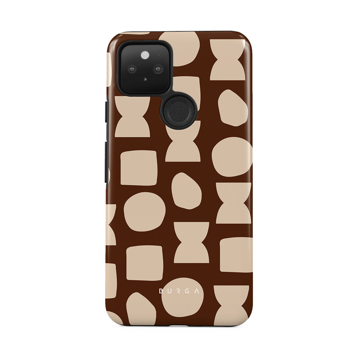 Our Terracotta Google Pixel 5 phone case design whispers warmth and grounded energy. Against a rich brown background, an interplay of light shapes unfolds, captivating the eye with an array of circles, squares, and hourglasses. Each shape is a testament to the beauty found in simplicity.