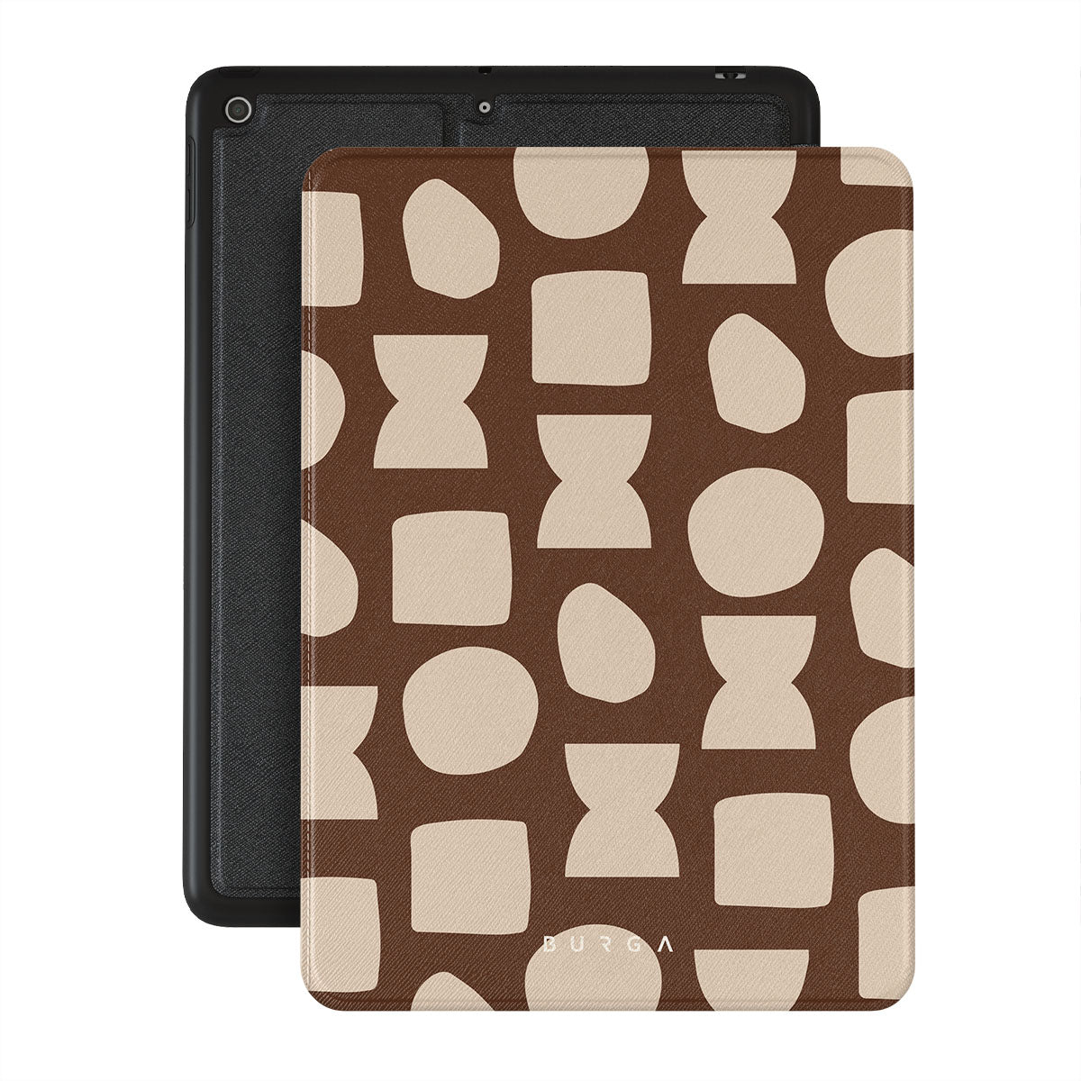 Our Terracotta iPad 10.2 (9th/8th/7th Gen) folio case design whispers warmth and grounded energy. Against a rich brown background, an interplay of light shapes unfolds, captivating the eye with an array of circles, squares, and hourglasses. Each shape is a testament to the beauty found in simplicity.