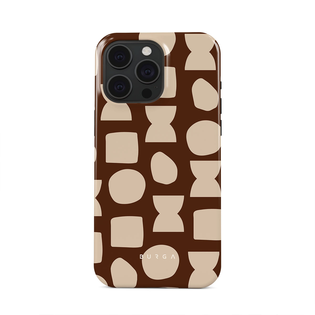 Our Terracotta iPhone 15 Pro phone case design whispers warmth and grounded energy. Against a rich brown background, an interplay of light shapes unfolds, captivating the eye with an array of circles, squares, and hourglasses. Each shape is a testament to the beauty found in simplicity.