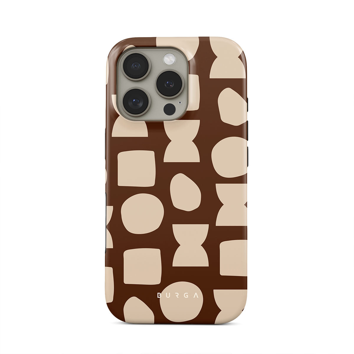 Our Terracotta iPhone 16 Pro phone case design whispers warmth and grounded energy. Against a rich brown background, an interplay of light shapes unfolds, captivating the eye with an array of circles, squares, and hourglasses. Each shape is a testament to the beauty found in simplicity.