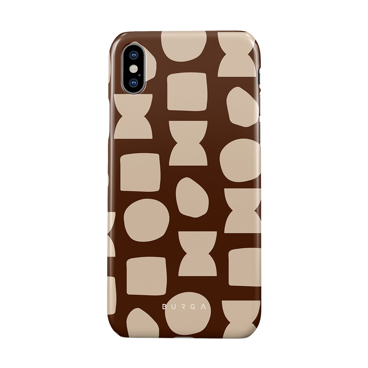 Our Terracotta iPhone XS Max phone case design whispers warmth and grounded energy. Against a rich brown background, an interplay of light shapes unfolds, captivating the eye with an array of circles, squares, and hourglasses. Each shape is a testament to the beauty found in simplicity.