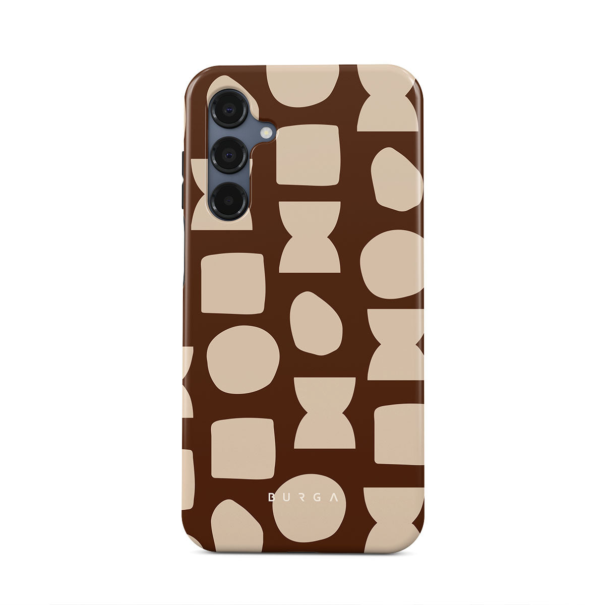 Our Terracotta Samsung Galaxy A16 phone case design whispers warmth and grounded energy. Against a rich brown background, an interplay of light shapes unfolds, captivating the eye with an array of circles, squares, and hourglasses. Each shape is a testament to the beauty found in simplicity.