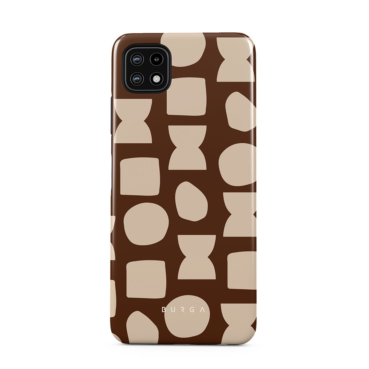 Our Terracotta Samsung Galaxy A22 5G phone case design whispers warmth and grounded energy. Against a rich brown background, an interplay of light shapes unfolds, captivating the eye with an array of circles, squares, and hourglasses. Each shape is a testament to the beauty found in simplicity.