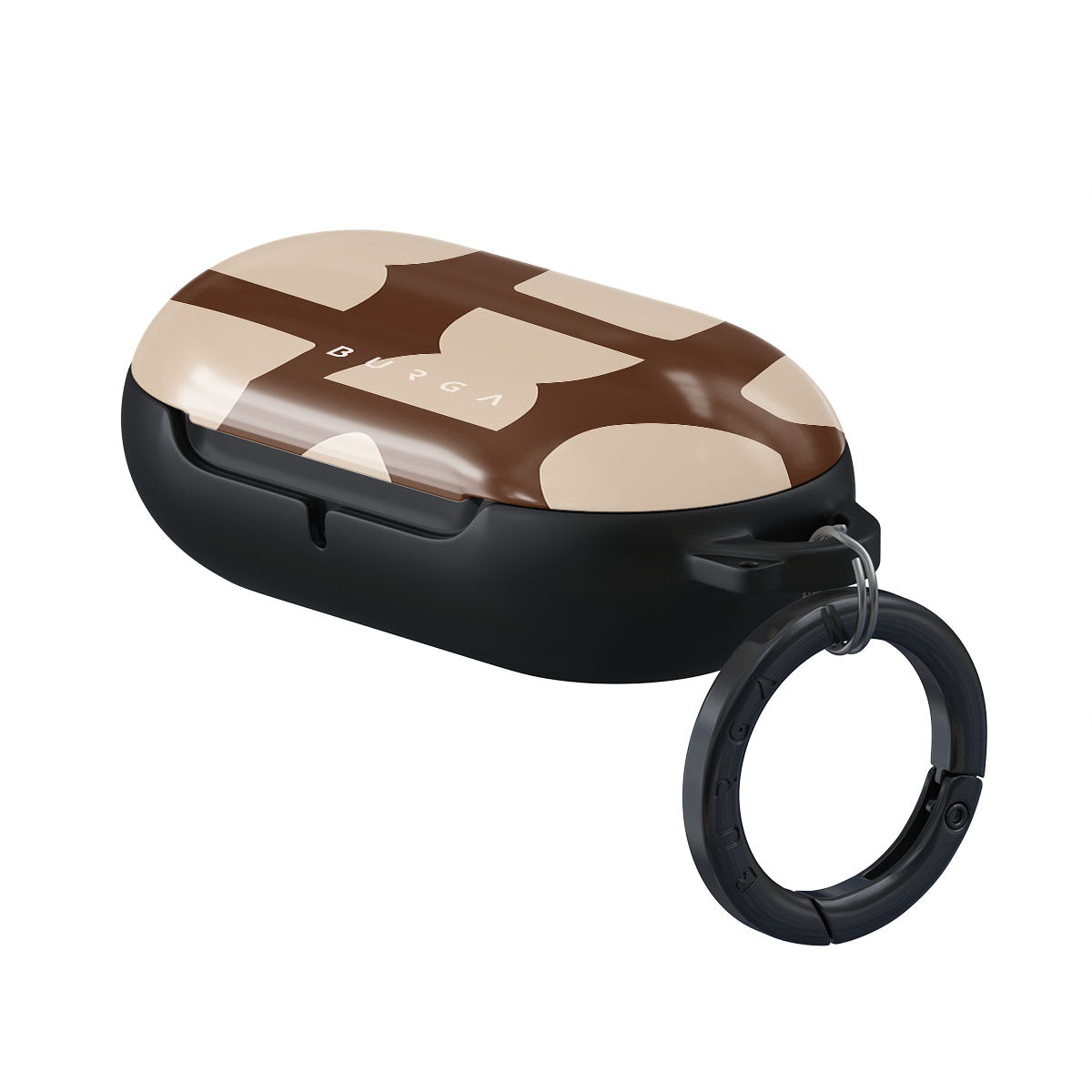 Our Terracotta Samsung Galaxy Buds case cover design whispers warmth and grounded energy. Against a rich brown background, an interplay of light shapes unfolds, captivating the eye with an array of circles, squares, and hourglasses. Each shape is a testament to the beauty found in simplicity.