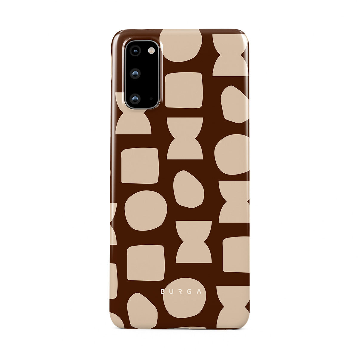 Our Terracotta Samsung Galaxy S20 4G / 5G phone case design whispers warmth and grounded energy. Against a rich brown background, an interplay of light shapes unfolds, captivating the eye with an array of circles, squares, and hourglasses. Each shape is a testament to the beauty found in simplicity.