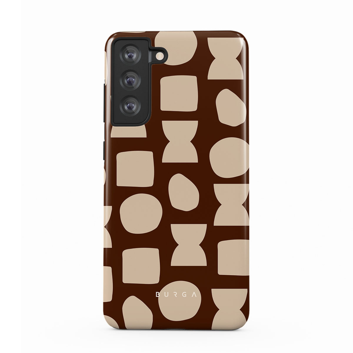Our Terracotta Samsung Galaxy S21 FE phone case design whispers warmth and grounded energy. Against a rich brown background, an interplay of light shapes unfolds, captivating the eye with an array of circles, squares, and hourglasses. Each shape is a testament to the beauty found in simplicity.
