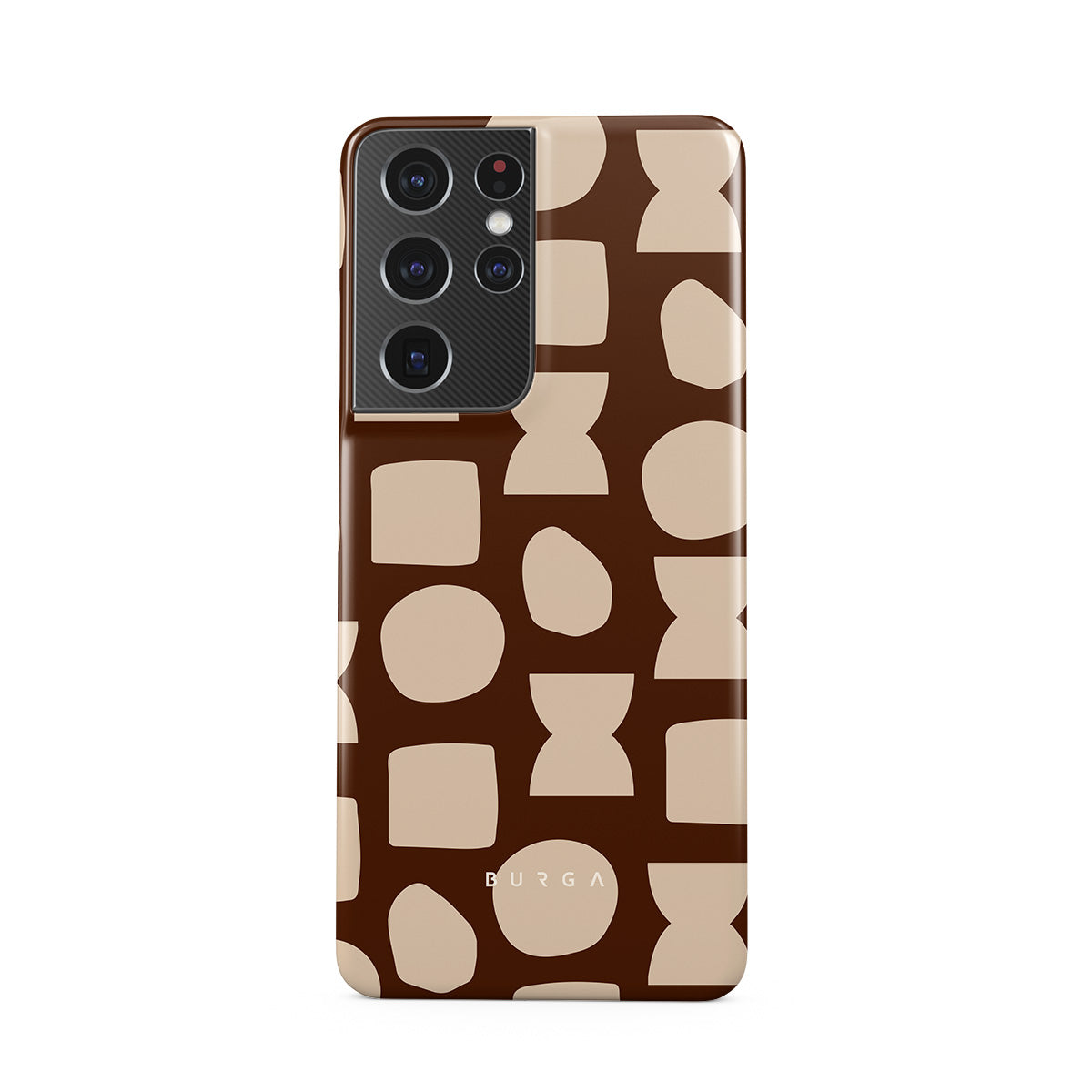 Our Terracotta Samsung Galaxy S21 Ultra phone case design whispers warmth and grounded energy. Against a rich brown background, an interplay of light shapes unfolds, captivating the eye with an array of circles, squares, and hourglasses. Each shape is a testament to the beauty found in simplicity.