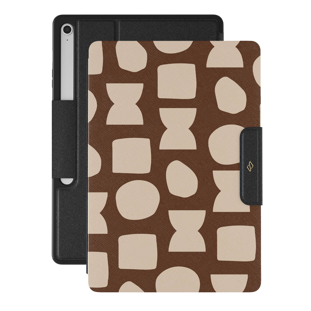 Our Terracotta Samsung Galaxy Tab S10+ FE folio case design whispers warmth and grounded energy. Against a rich brown background, an interplay of light shapes unfolds, captivating the eye with an array of circles, squares, and hourglasses. Each shape is a testament to the beauty found in simplicity.