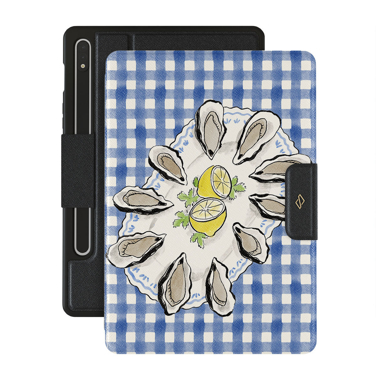 Fresh oysters, zesty lemon, and a touch of Mediterranean breeze wrapped in blue gingham. This Samsung Galaxy Tab S9 FE folio case design is the secret menu only locals know about—simple, fresh, and absolutely irresistible.