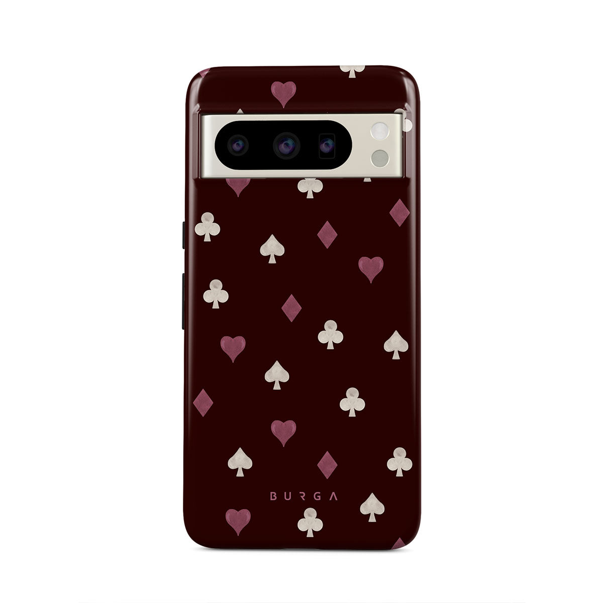 Nothing is as it appears. Hearts, clubs, diamonds, and spades—stacked in your favor or playing against you? This Google Pixel 8 Pro phone case design features a rich burgundy background and minimalist suits that make for a game where the rules are constantly shifting.